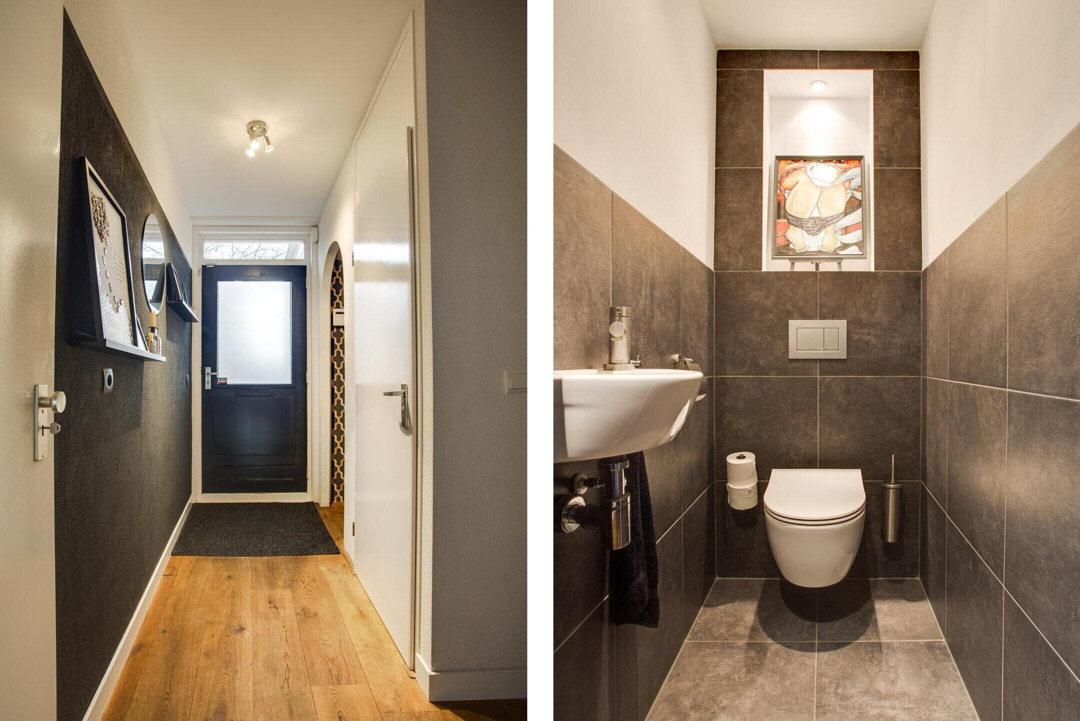 Via de entree komt u binnen in de hal met meterkast, een fraaie garderobe nis, trapopgang, separaat toilet met fontein en toegang tot de woonkamer.