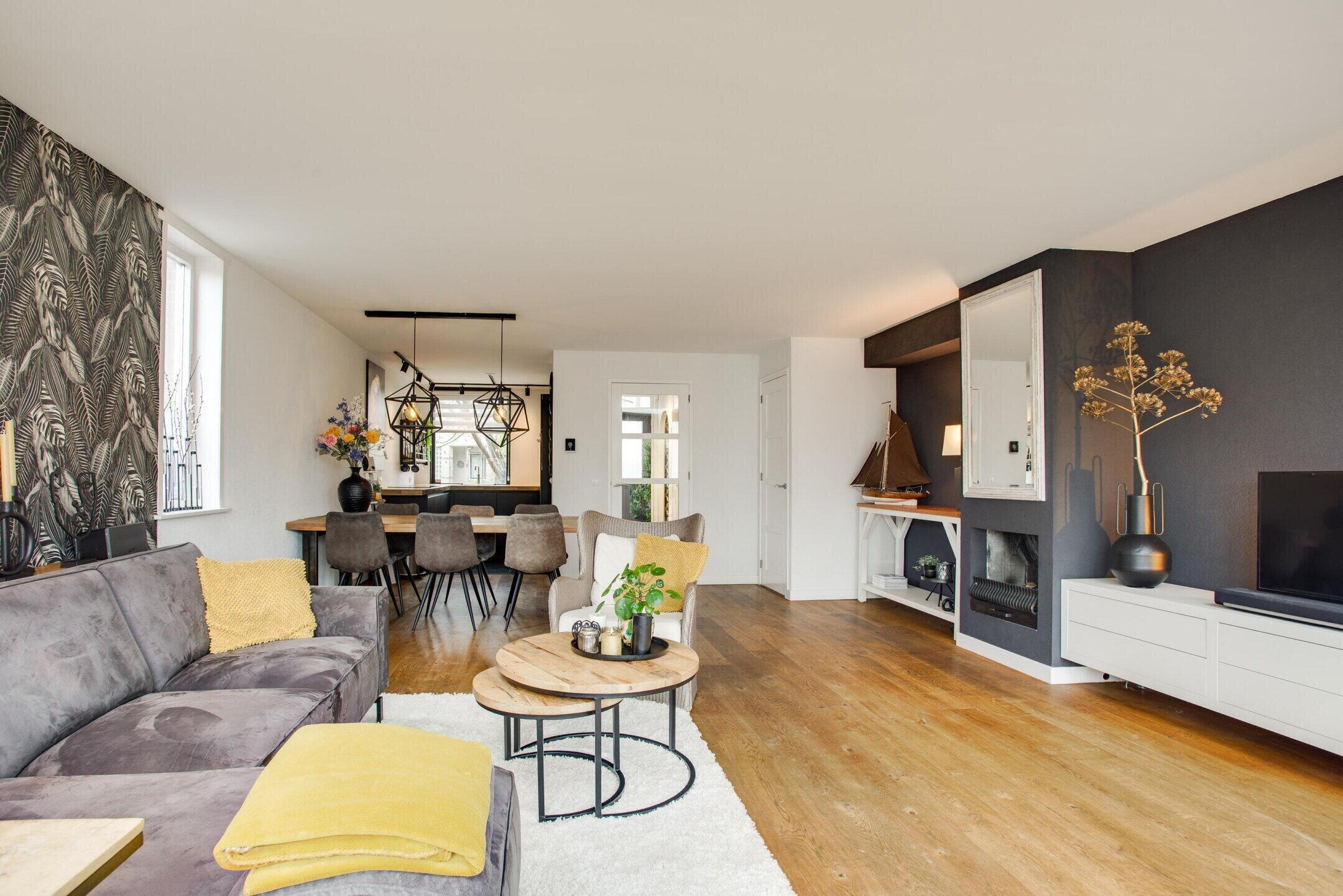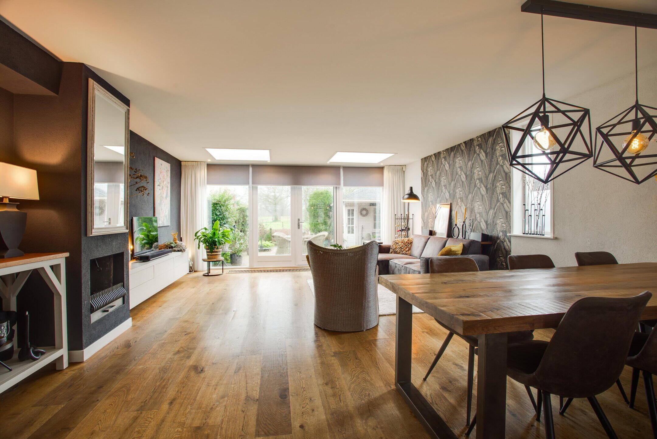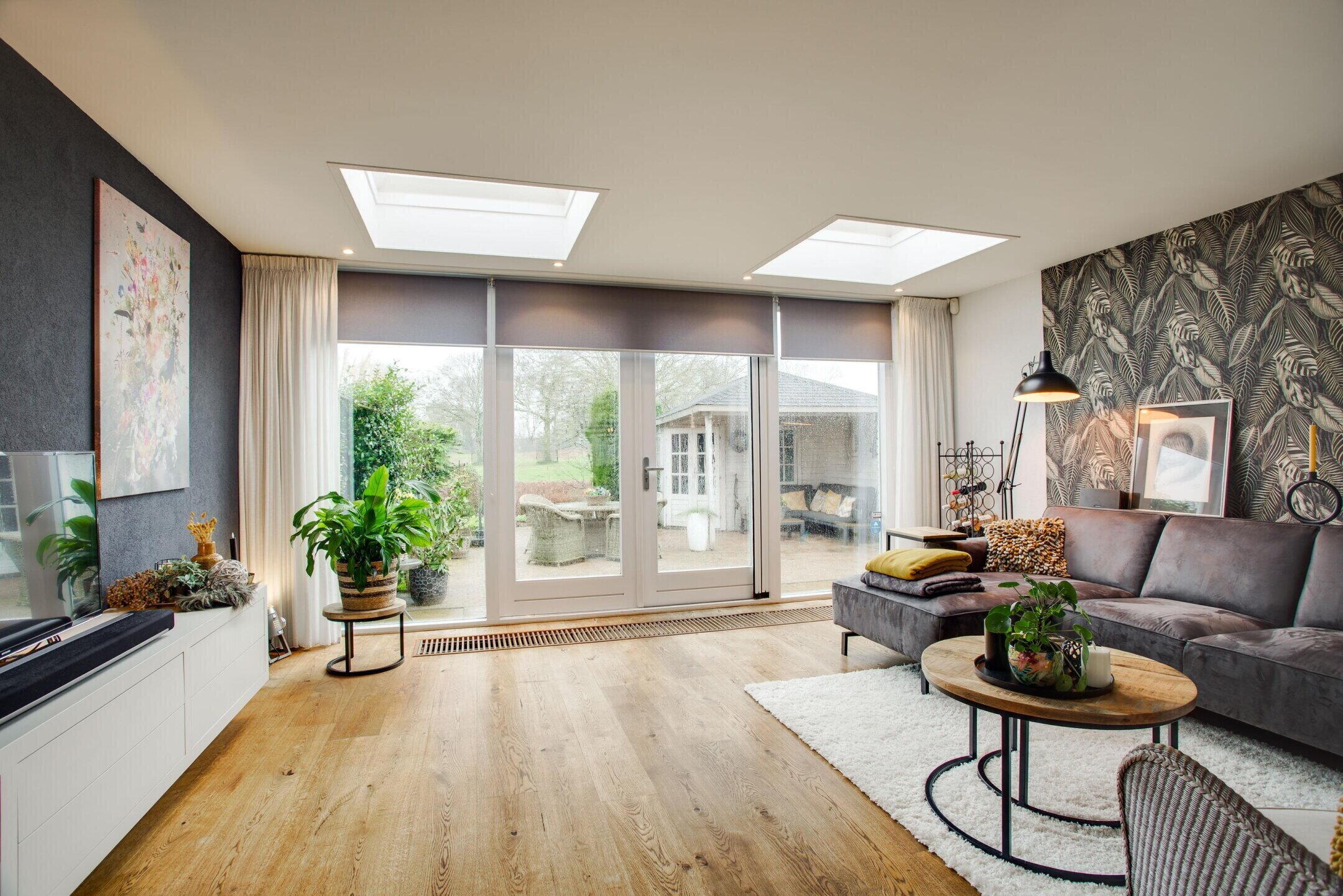 De woonkamer is ruim opgezet en profiteert van veel lichtinval dankzij de hoekligging met zijraam, de grote raampartijen aan de achterzijde en de twee lichtkoepels in de uitbouw. Dit zorgt voor een aangename en lichte leefruimte.