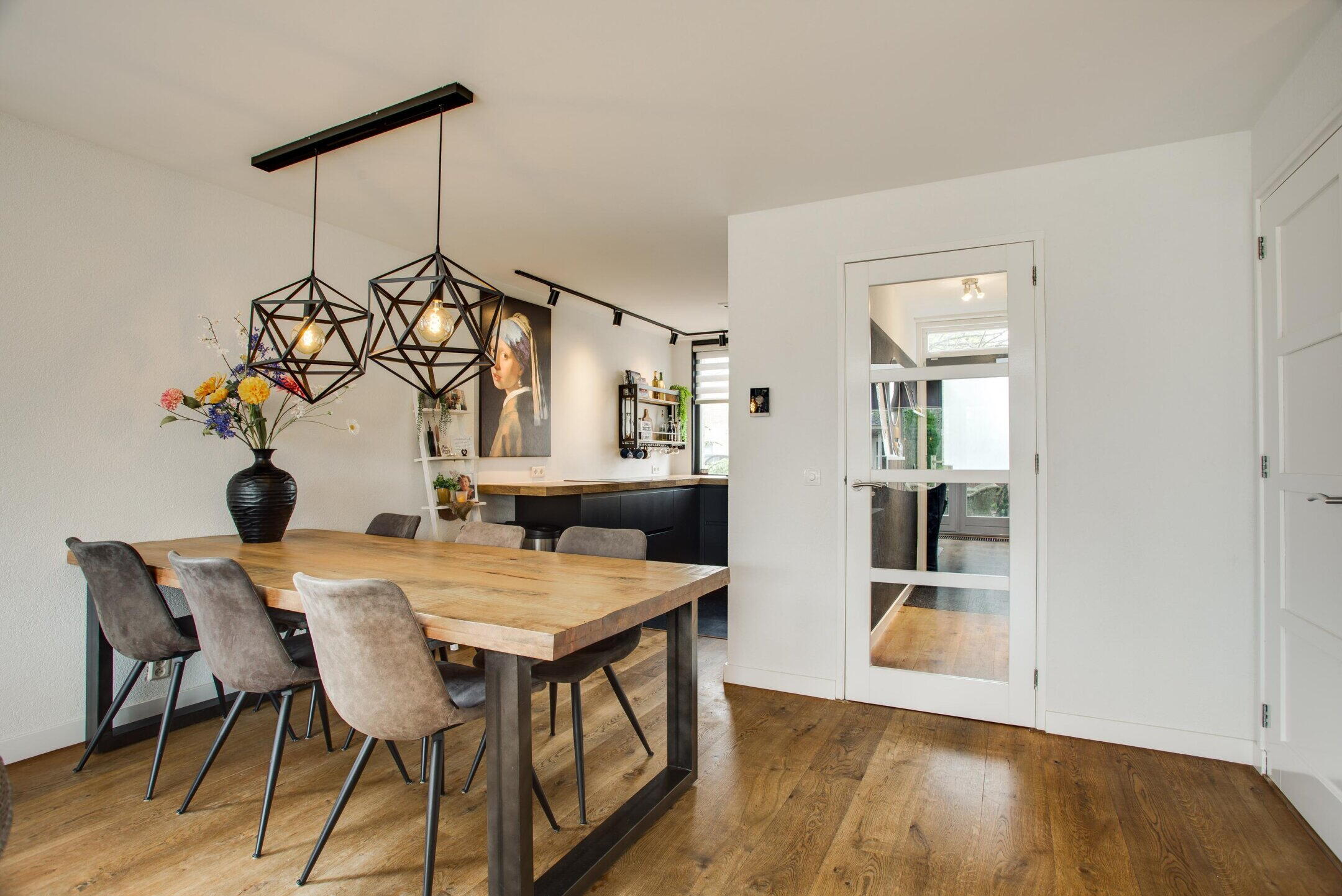 Aan de voorzijde bevindt zich de moderne keuken (2022), uitgevoerd met een inductiekookplaat, combi-oven, vaatwasser, quooker en een koel-vriescombinatie. De keuken is strak afgewerkt en van alle gemakken voorzien.