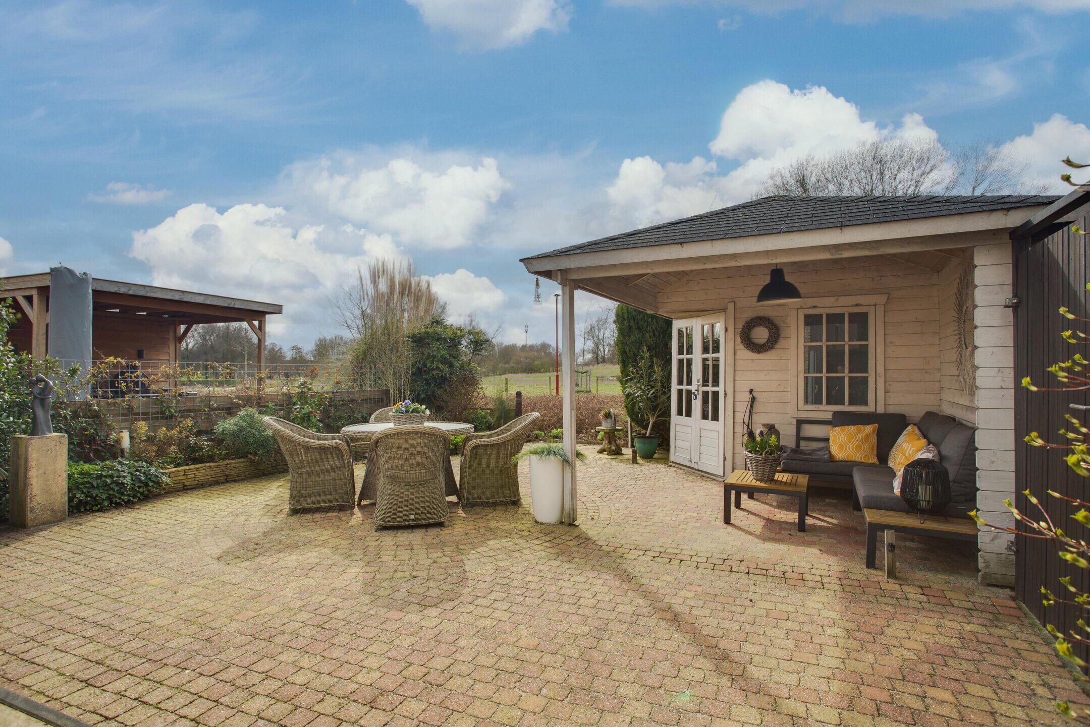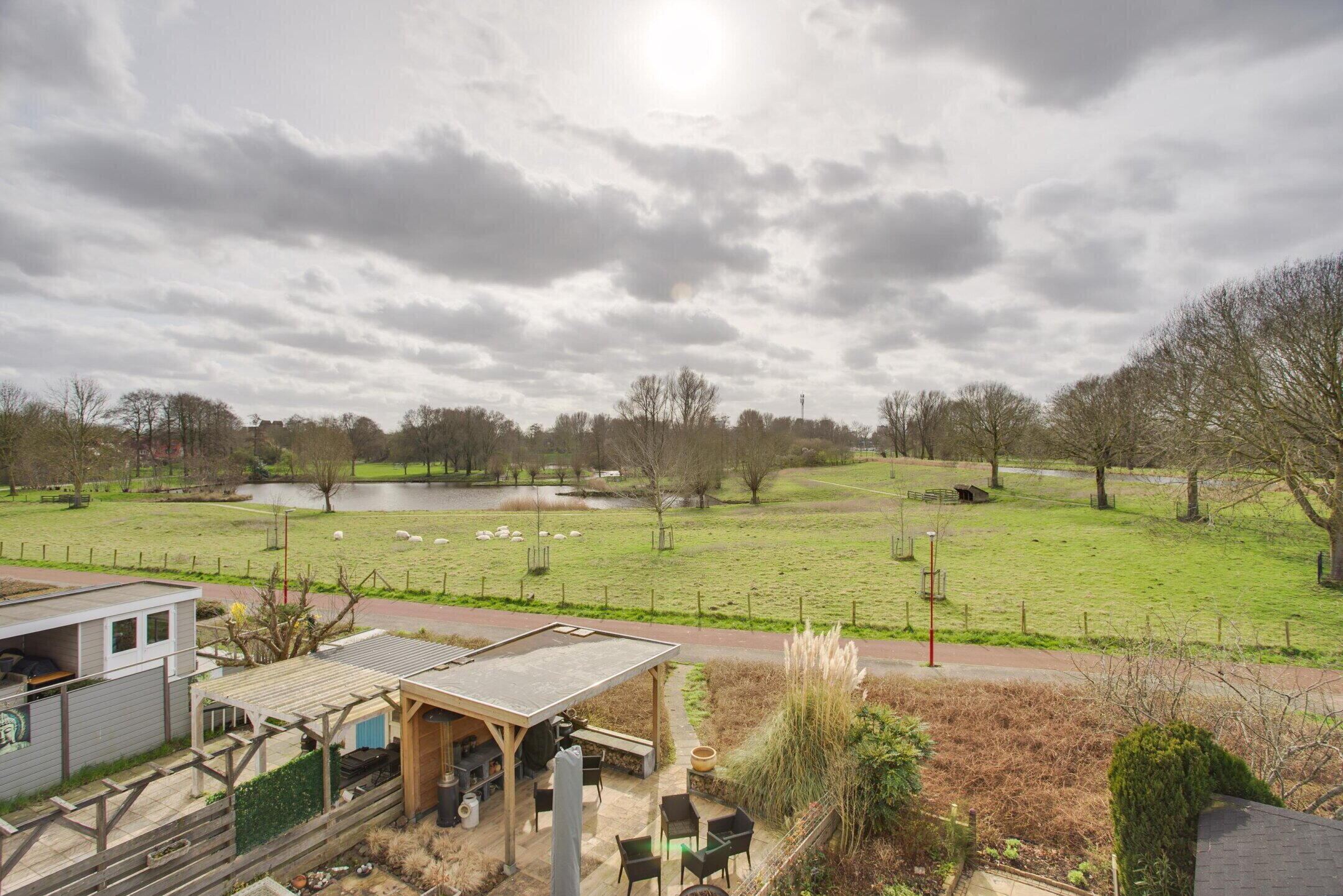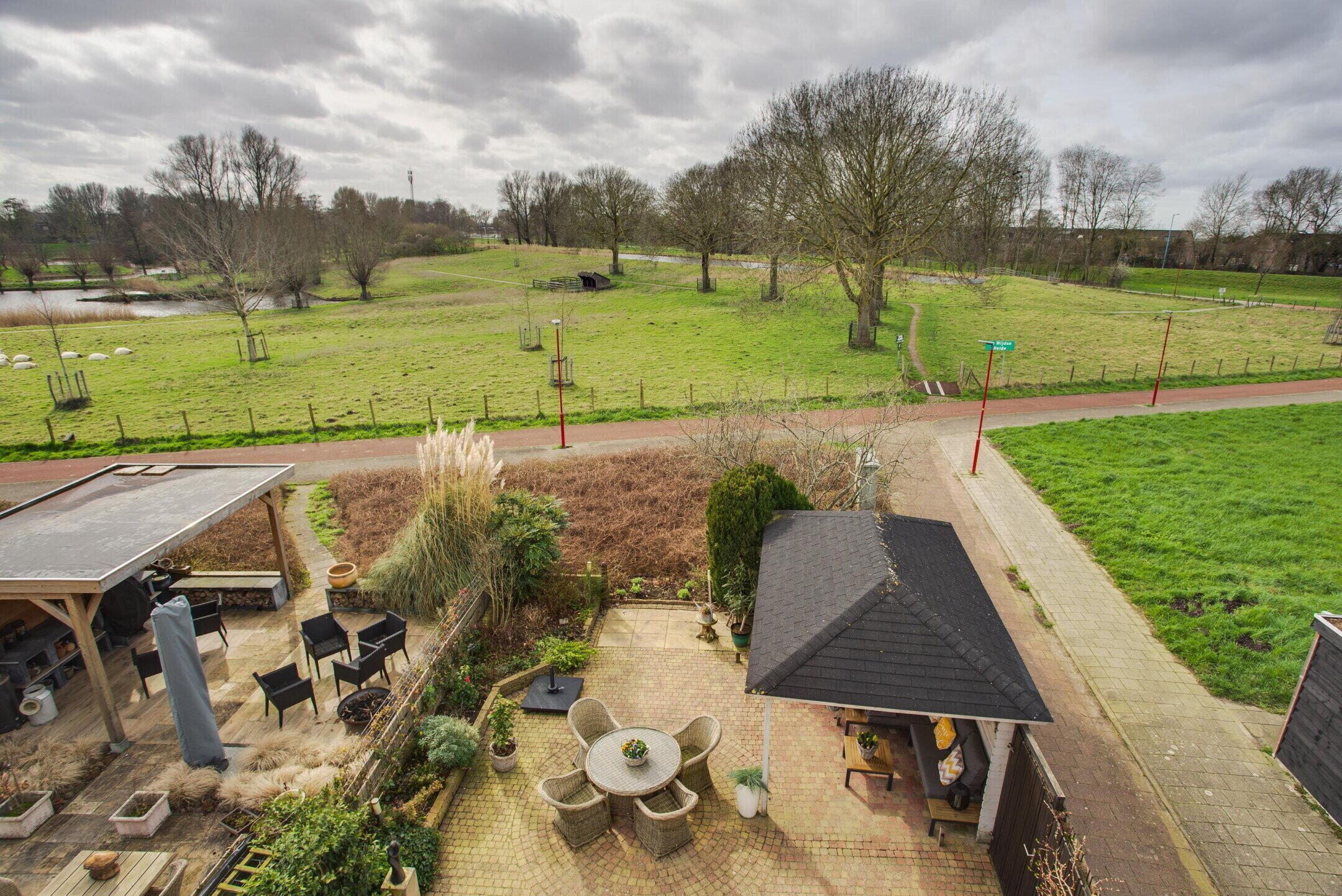 De achtertuin is gelegen op het zuidwesten en biedt een prachtig vrij uitzicht over de Wijdse Weide met Schapenweide. Hier geniet u optimaal van rust, ruimte en zon. Achterin de tuin bevindt zich een vrijstaande berging met een overkapping, wat zorgt voor extra bergruimte en een fijne plek om beschut buiten te zitten.