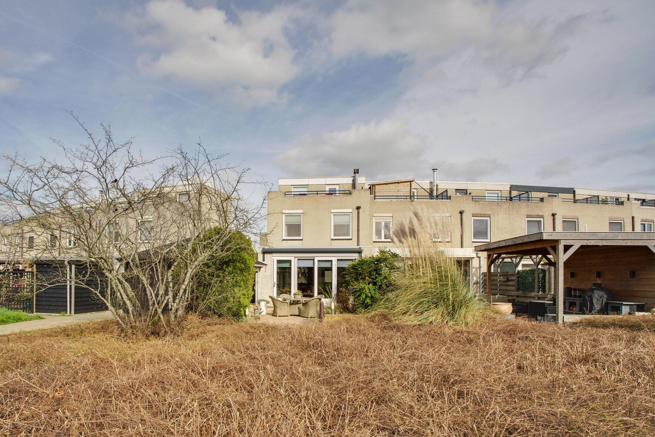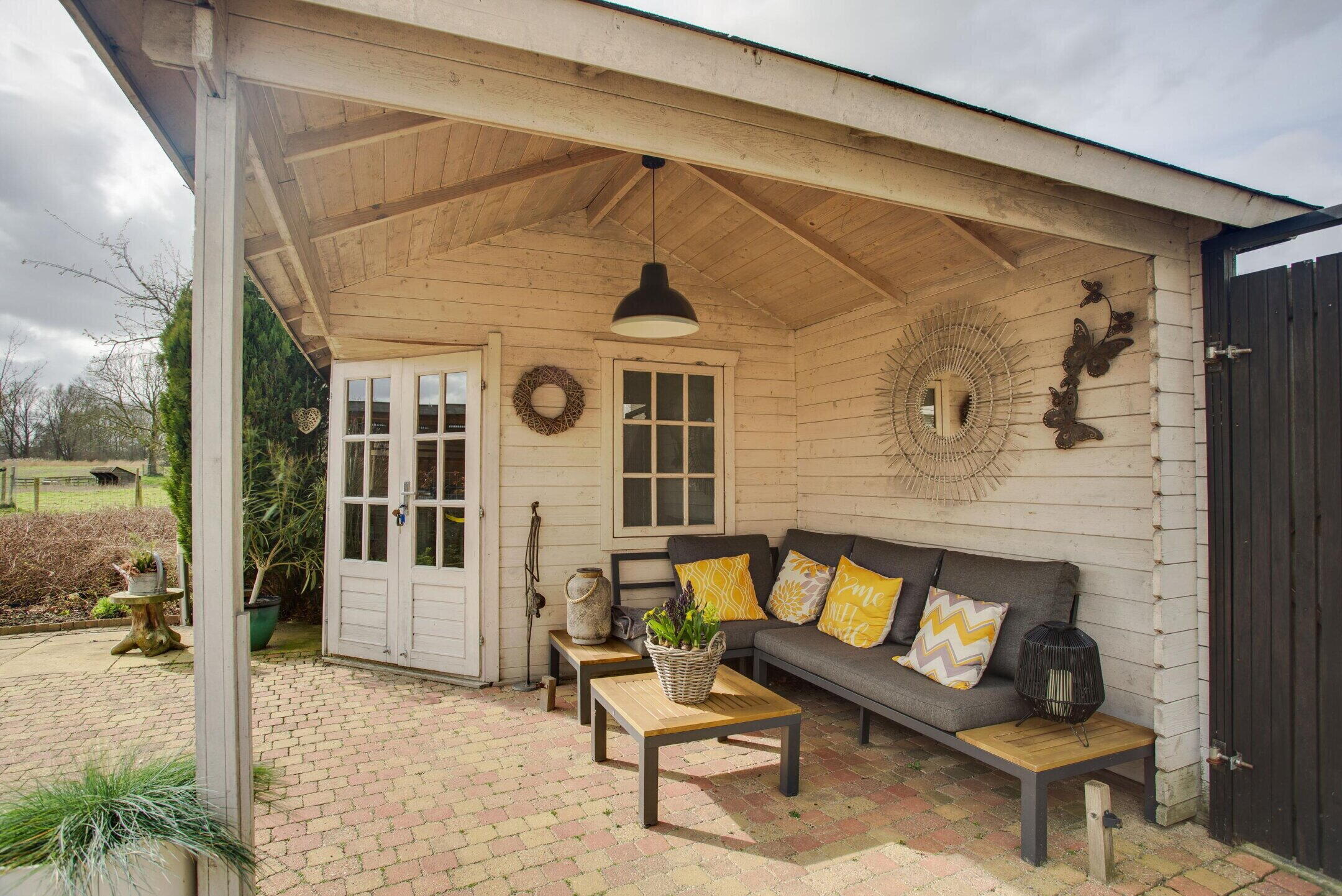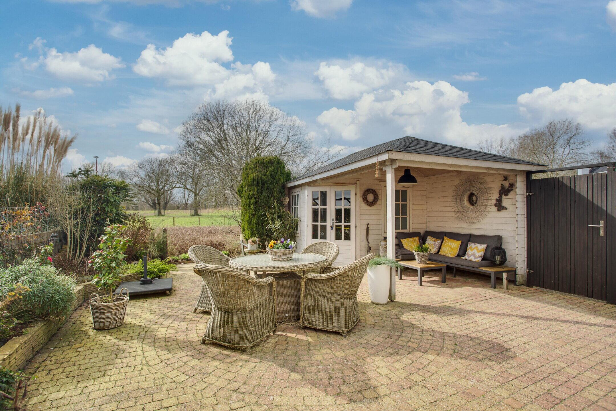 De achtertuin is gelegen op het zuidwesten en biedt een prachtig vrij uitzicht over de Wijdse Weide met Schapenweide. Hier geniet u optimaal van rust, ruimte en zon. Achterin de tuin bevindt zich een vrijstaande berging met een overkapping, wat zorgt voor extra bergruimte en een fijne plek om beschut buiten te zitten.