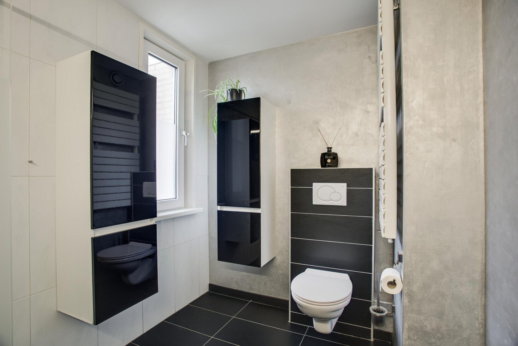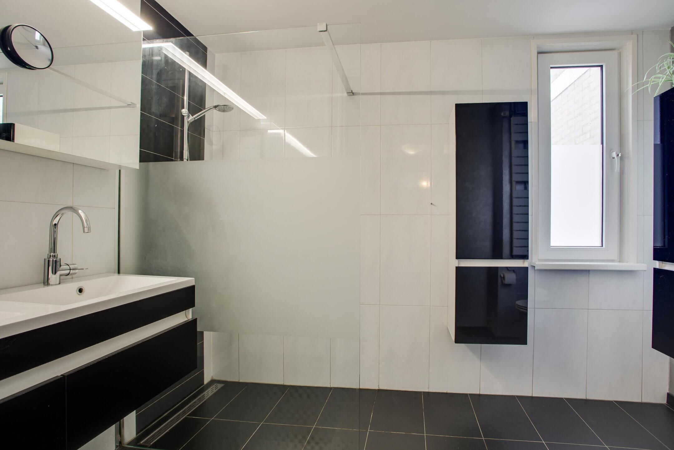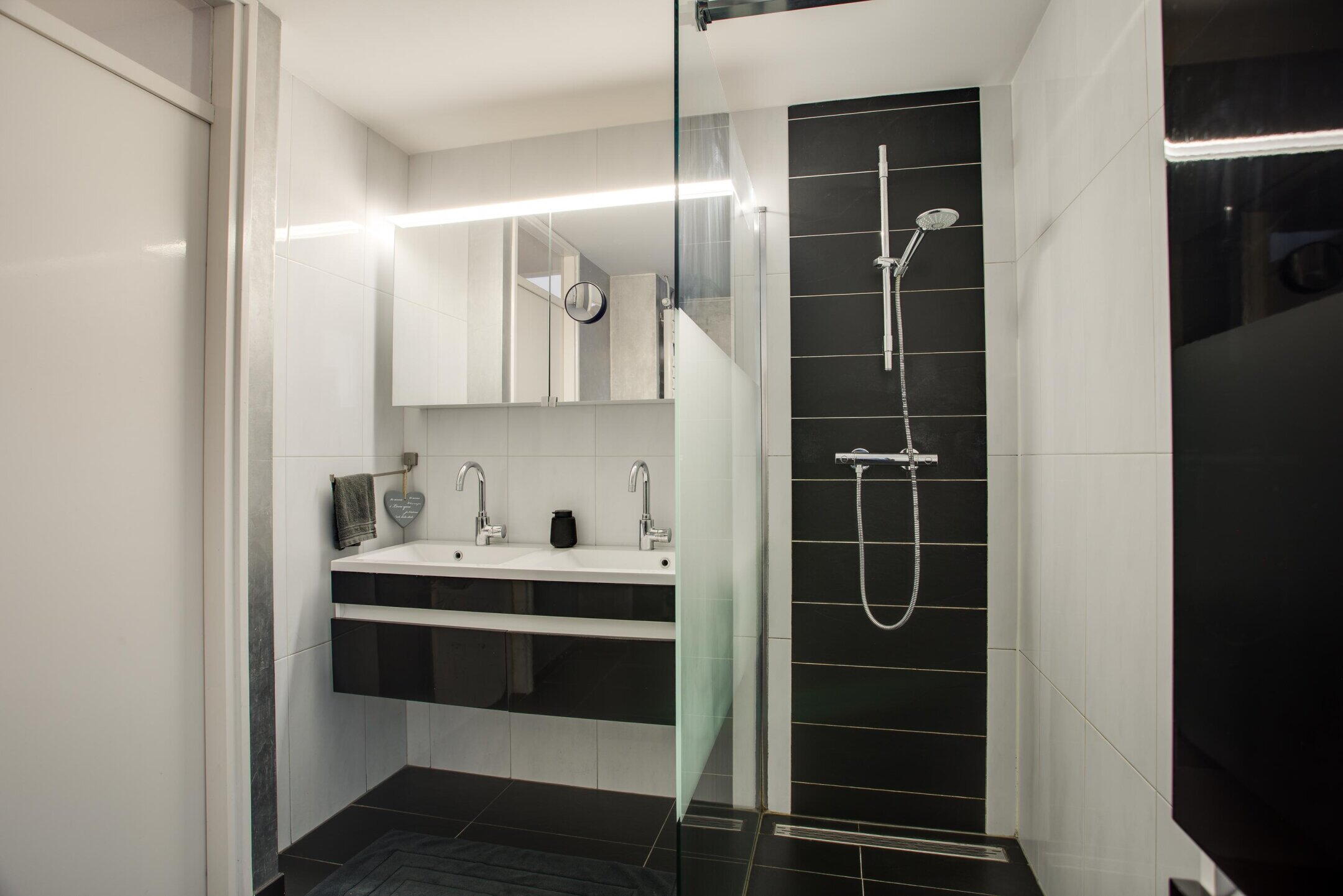 De verzorgd afgewerkte badkamer is compleet uitgevoerd en beschikt over een inloopdouche, toilet en een dubbele wastafel met meubel.