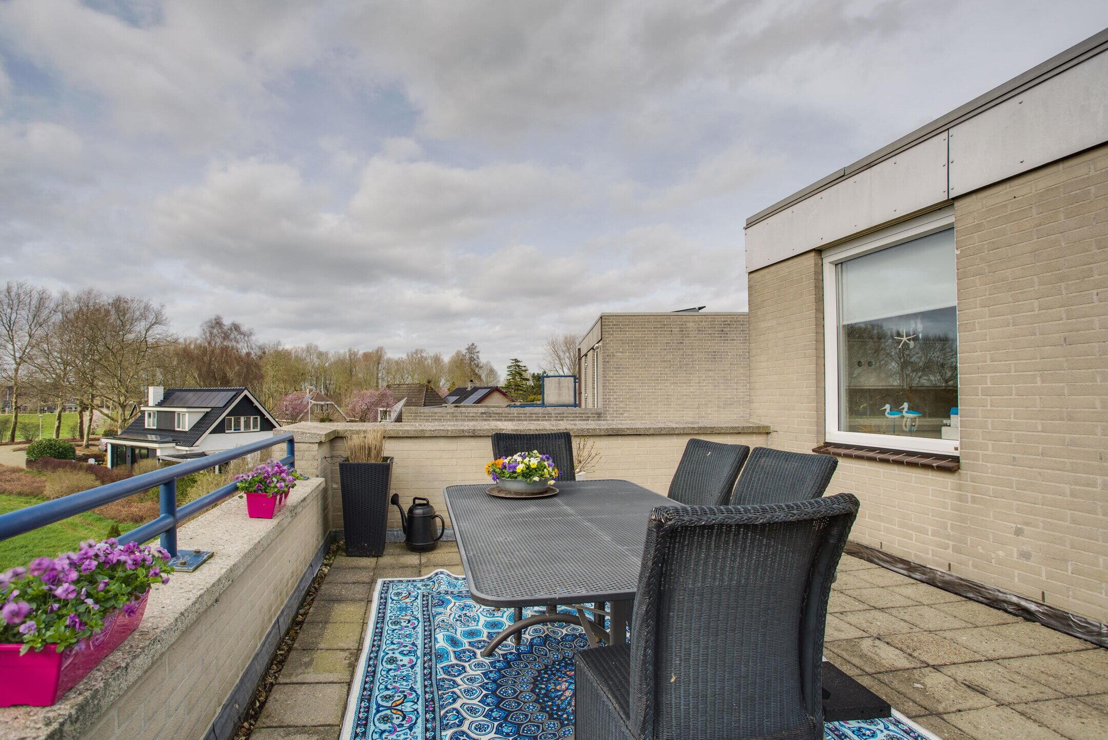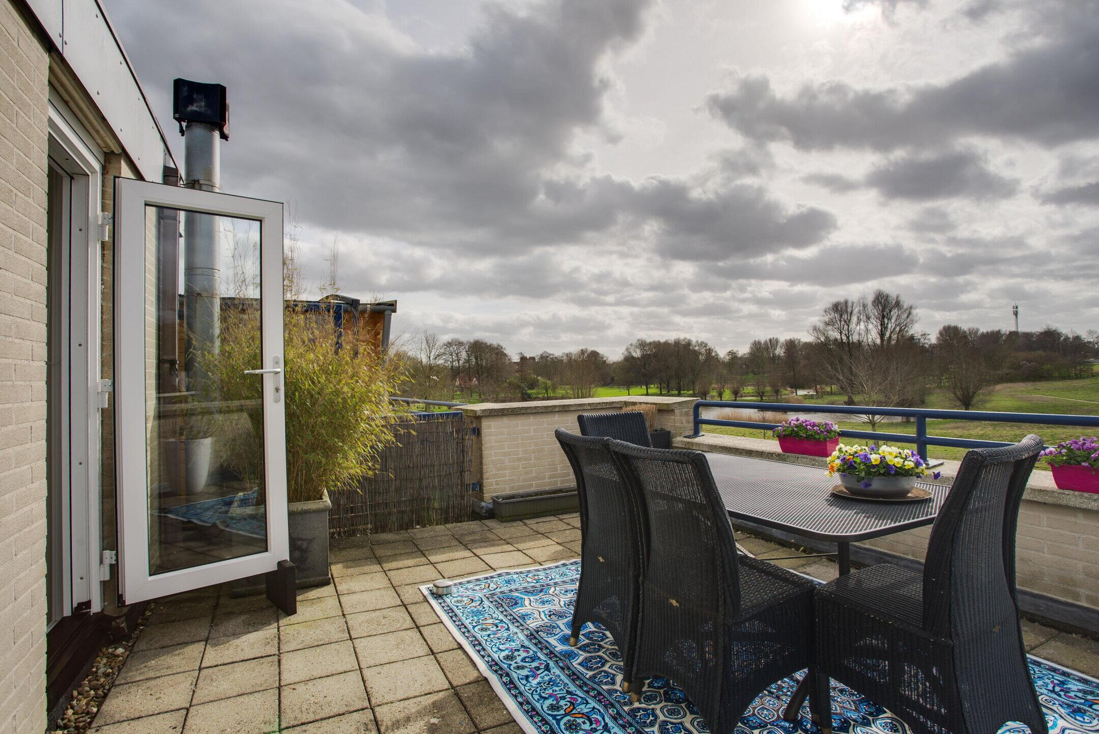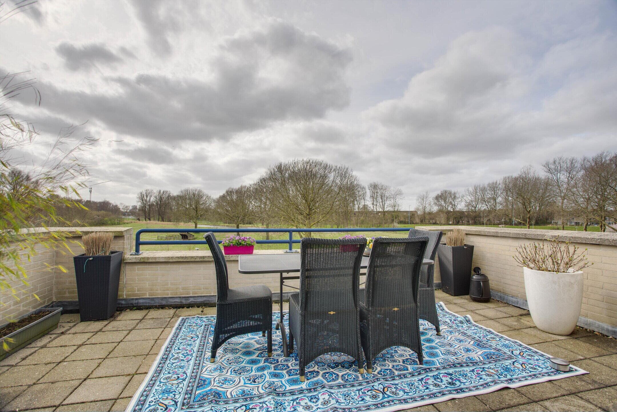 Het royale dakterras is gelegen op het zuidwesten en biedt, net als de tuin, een prachtig vrij uitzicht over de Wijdse Weide. Een heerlijke plek om in alle rust van de (avond)zon en het uitzicht te genieten.
